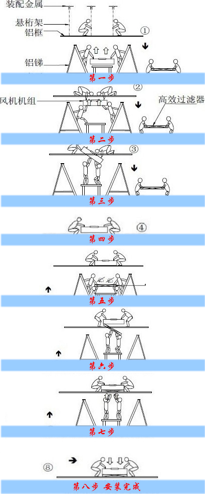 準(zhǔn)備好安裝時(shí)所需要使用到的工具,按下圖所示,兩個(gè)安裝人員事先登上天花板,打好裝配金屬,腳踏龍骨,雙手扶住懸桁架;兩位安裝人員把FFU平放在桌子上,而高效過濾器事先放在一旁。