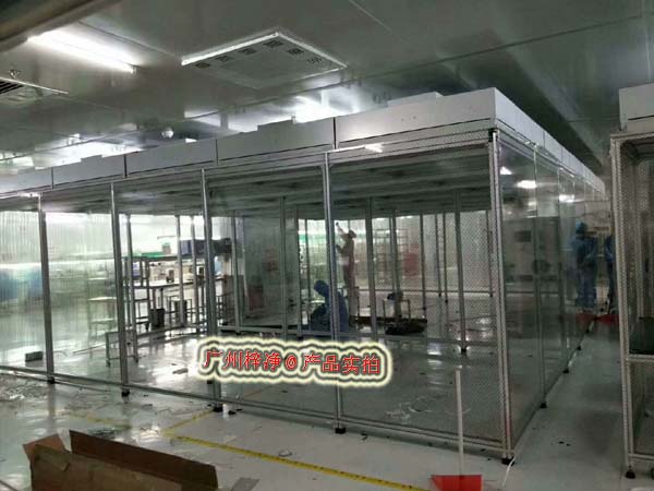 潔凈棚具體在高潔凈微環境的送風口處,由風機1、高效過濾單元2、緊固件3、鋁型材4、支撐墊片5和支架組成;支架組接成潔凈微環境空間的頂部,頂部材料一般為不銹鋼板、冷軋鋼板噴塑或防靜電亞克力板;