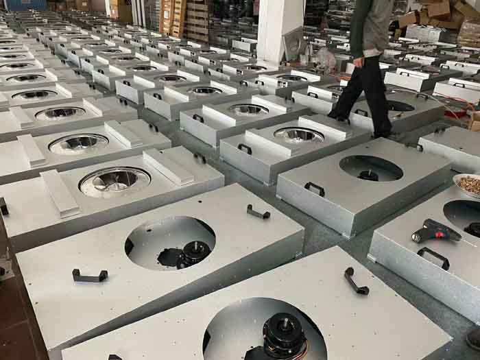 FFU風機過濾單元的三大組成部分(風機,初效,高效過濾器)FFU風機過濾單元英文全稱為(Fan Filter Unit),中文專業用語為風機過濾機組。 FFU風機濾單元可模塊化連接使用,廣泛應用于電子、制藥、食品、生物工程、醫療、實驗室等應用場合。FFU設有初效過濾器、高效兩級過濾網。風機從FFU頂部將空氣吸入并經初效過濾器、FFU高效過濾器過濾,過濾后的潔凈空氣在整個出風面以0.45M/S±20%的風速勻速送出。