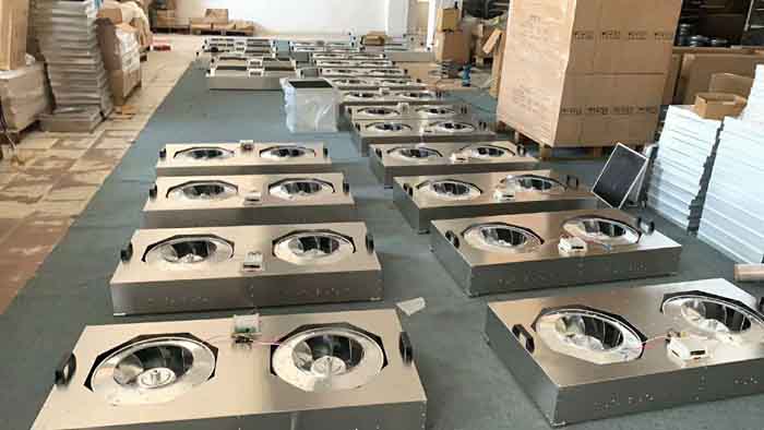 FFU確切地說(shuō)是一種自帶動(dòng)力、具有過(guò)濾功效的模塊化的末端送風(fēng)裝置。風(fēng)機(jī)從FFU頂部將空氣吸入并經(jīng)HEPA過(guò)濾,過(guò)濾后的潔凈空氣在整個(gè)出風(fēng)面以0.45m/s±20%的風(fēng)速均勻送出。