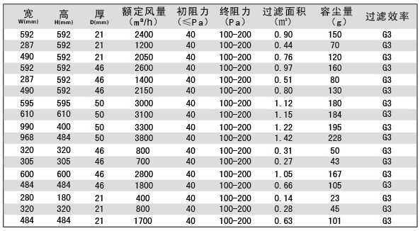 過濾效率:G1:40%@5.0μm、G2:65%@5.0μm、G3:85%@5.0μm、G4:90%@5.0μm(計重法);